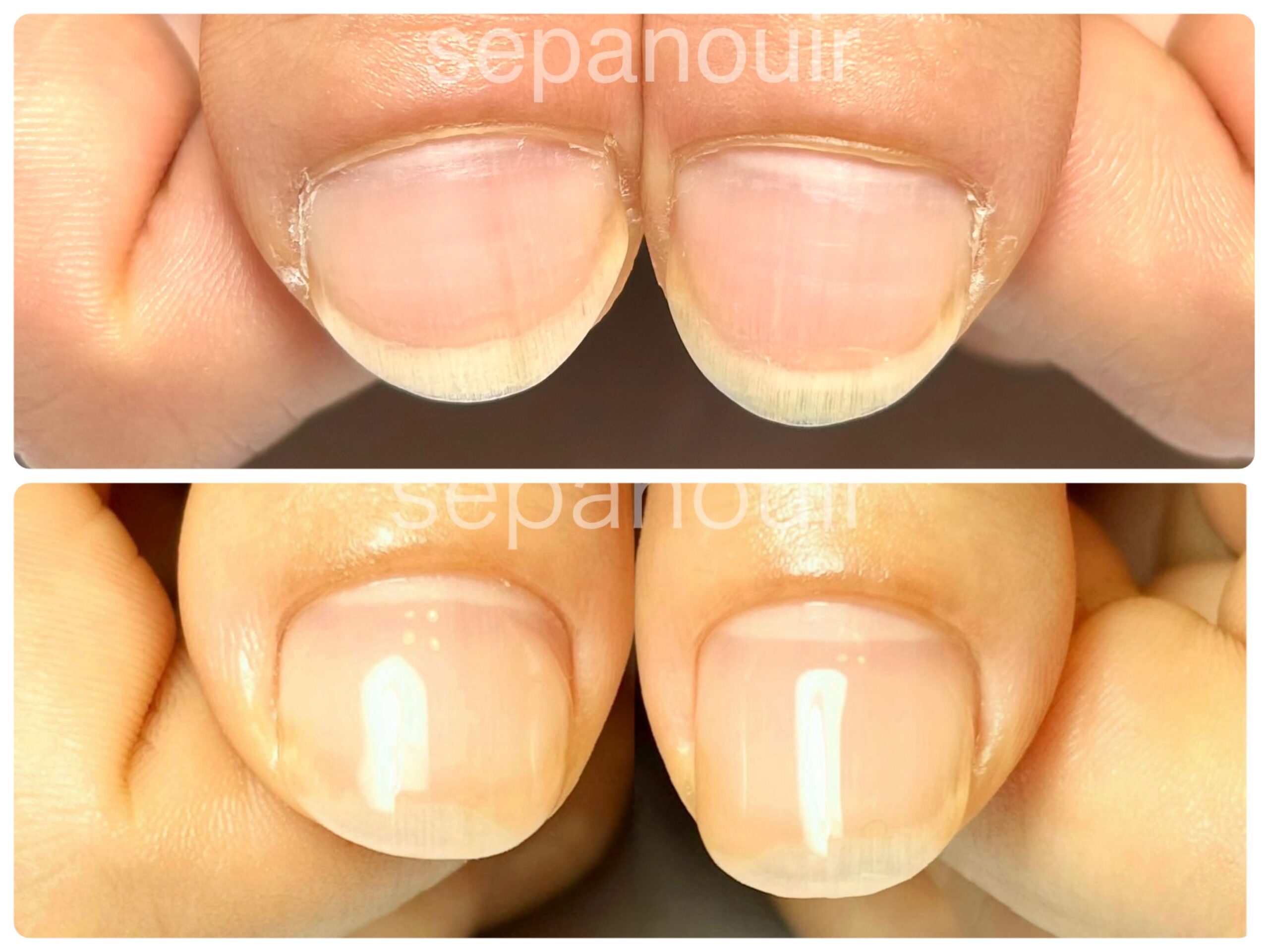 約1ヶ月半後のafterがこちら▼after マムシ爪は骨の形状の影響で爪が短い為成長の限界があるのですが1ヶ月半の短い期間でもここまでピンクの部分が伸びました爪の両サイドの部分に注目していただきますと違いが分かりやすいですね ▼比較写真
