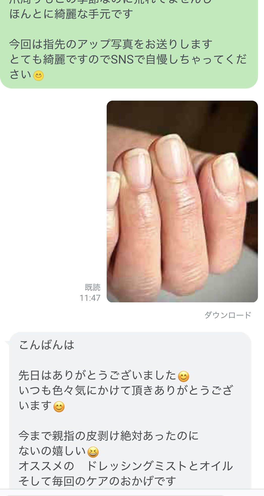 和泉市からお越しくださってるH様から素敵なお言葉いただきました▼LINEより(掲載了承いただいております)いつも真面目にアドバイスを実行してくださるので育成前と爪はもちろん肌の調子もとても良くなられて