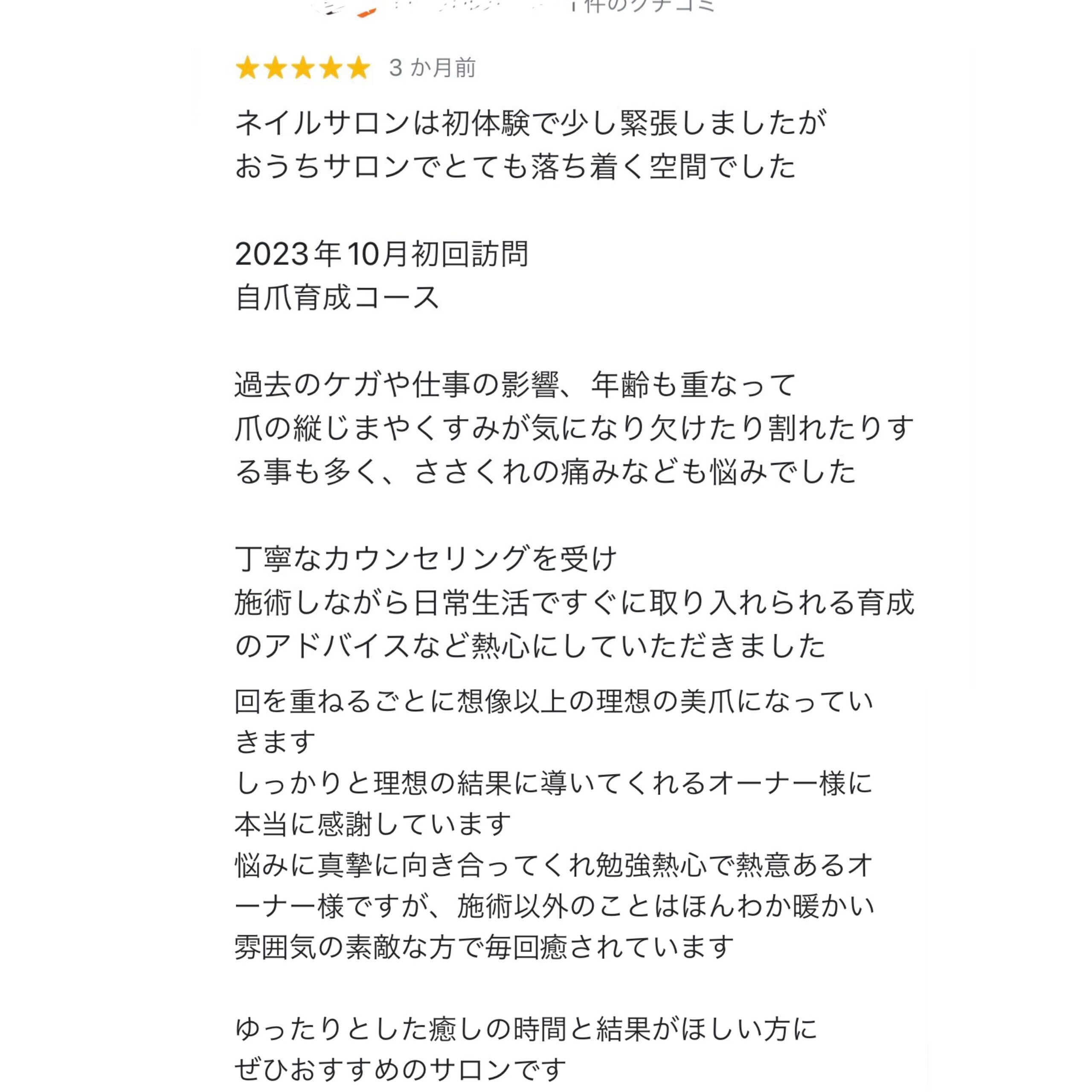 海南市からお越しくださっているK様からありがたい口コミをいただきました▼Googleマップより(掲載了承いただいております)仕事柄手を酷使されているK様手を使う分育成速度は遅くなりますがアドバイスをき